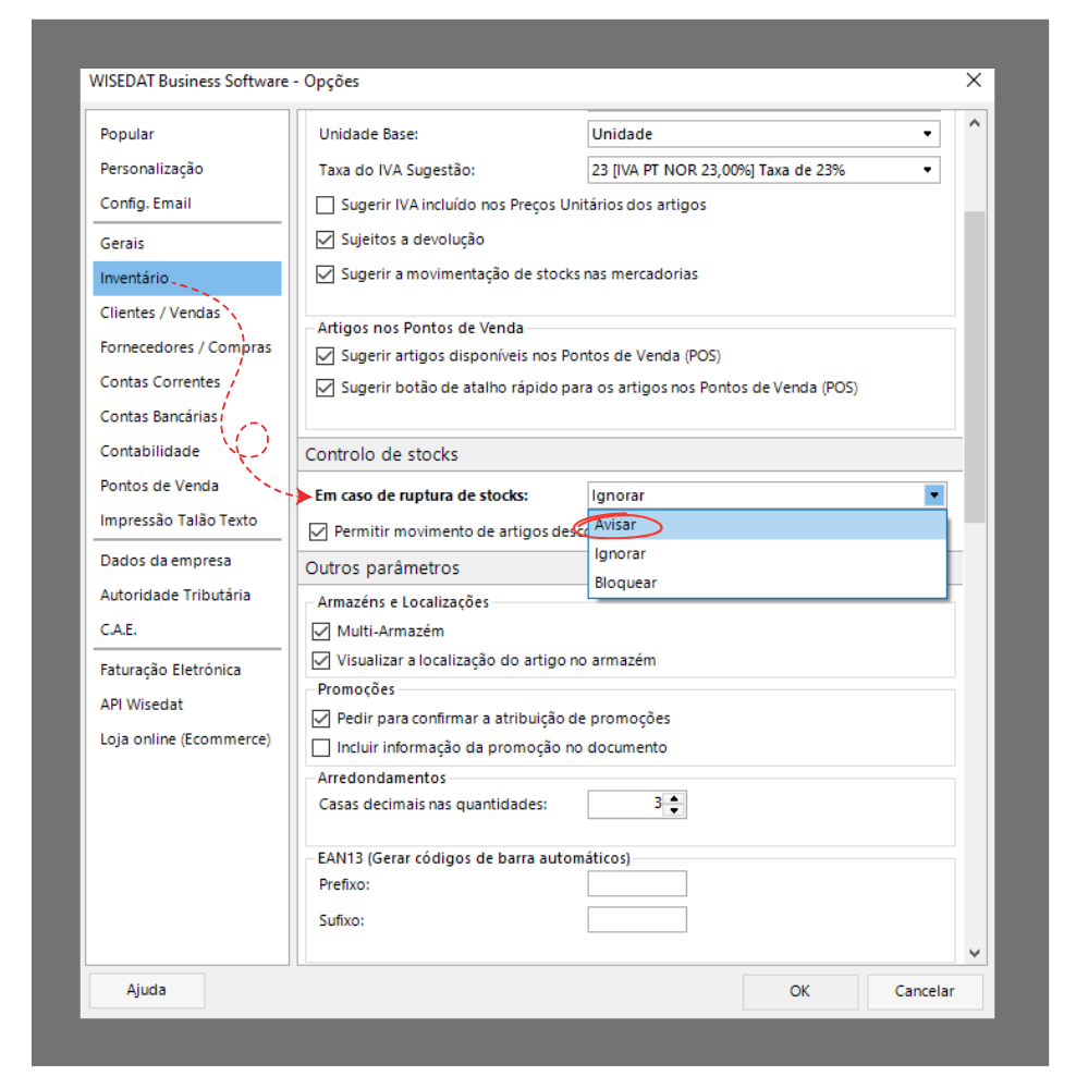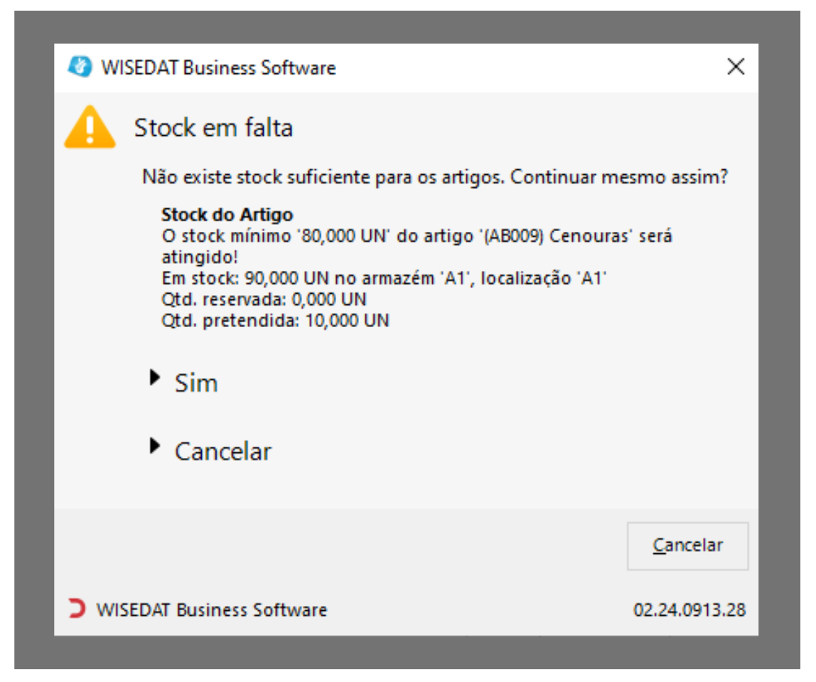 Esta funcionalidade deve ser ativada em Preferências do Wisedat Comercial | Inventário | Em caso de rutura de stocks: Avisar.