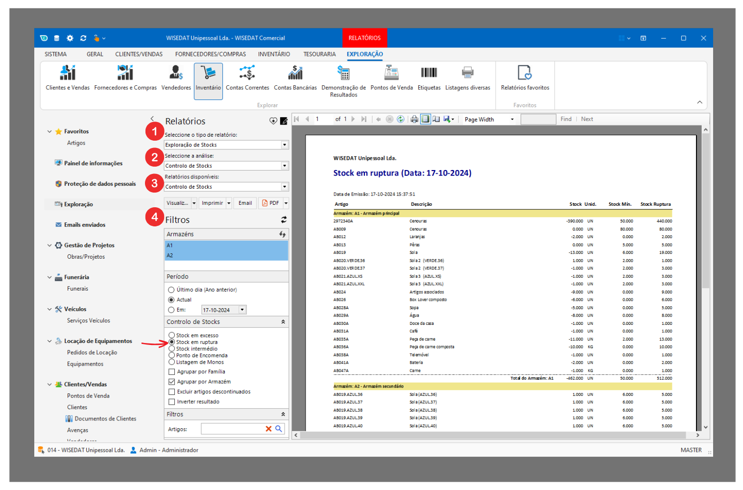 De forma a consultar ou extrair uma listagem de artigos em rutura de stock aceda a Exploração | Inventário.
