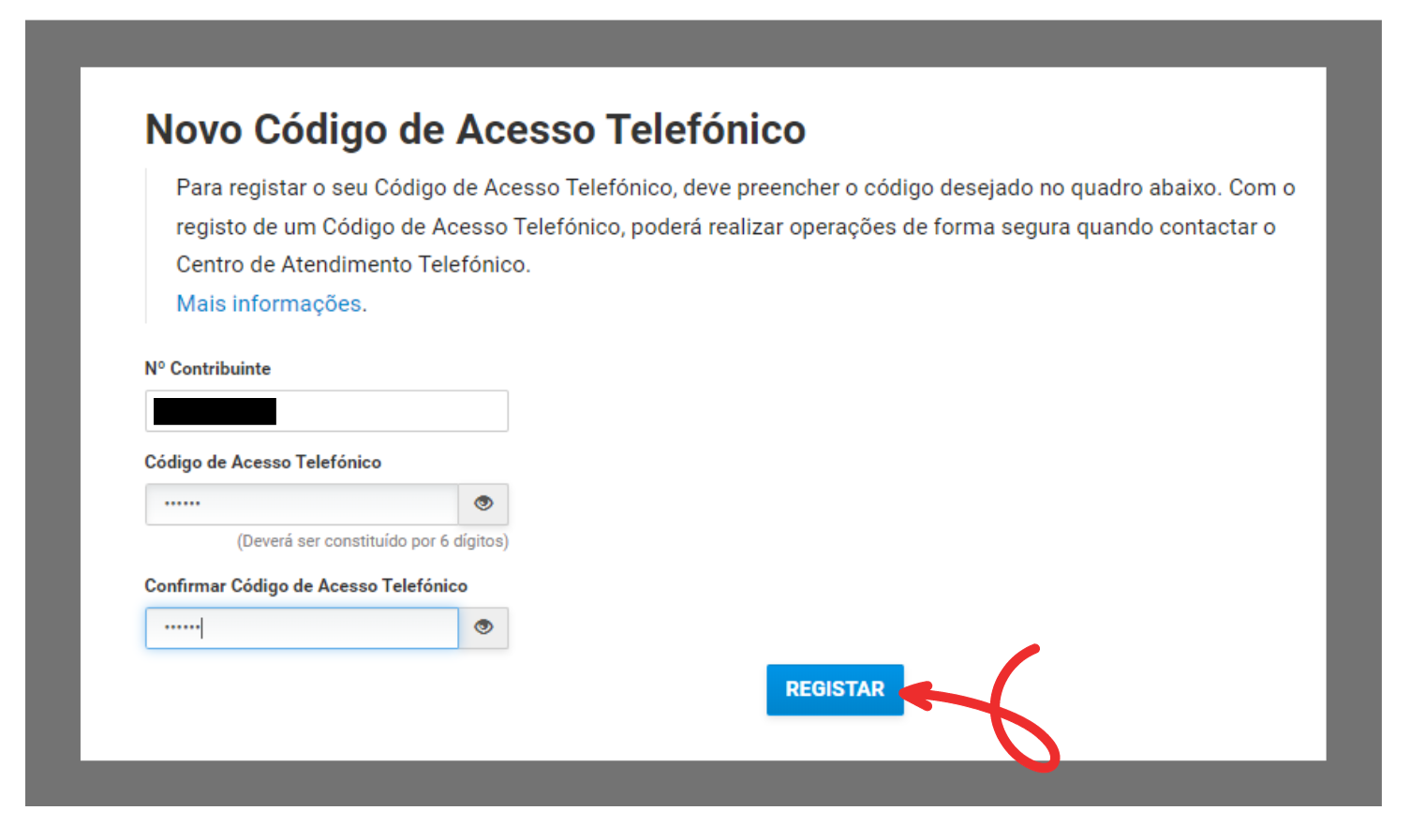 Aceda ao Portal das Finanças em: Cidadãos | Serviços | Autenticação de Contribuintes | Registar, preencha com o código de acesso escolhido por si (6 dígitos), confirme o código e clique em REGISTAR.