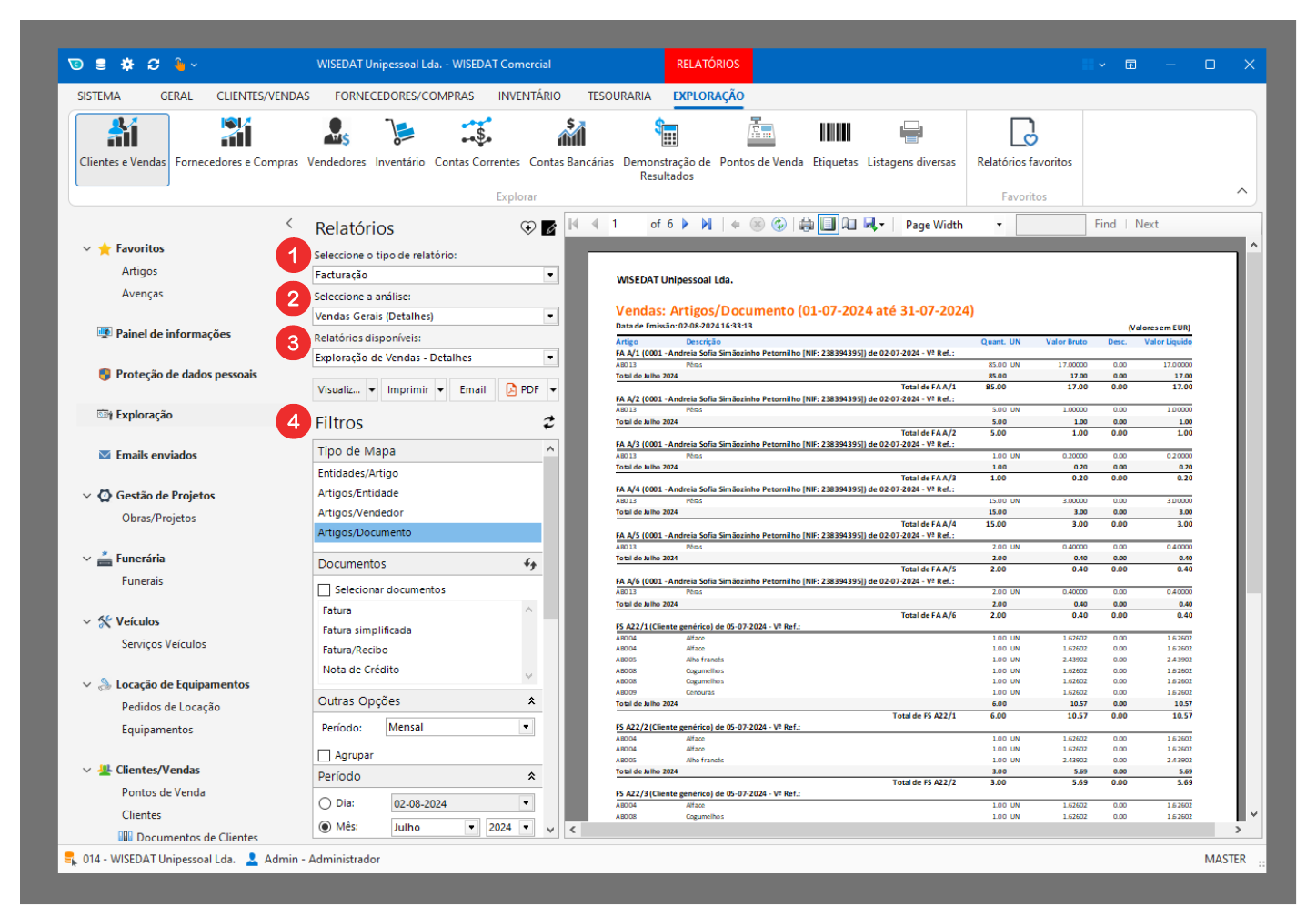 A Exploração de Relatórios do WISEDAT Comercial permite diversas ações, como por exemplo, consultar, imprimir, enviar relatórios e exportá-los para diferentes formatos, Excel, PDF ou Word.