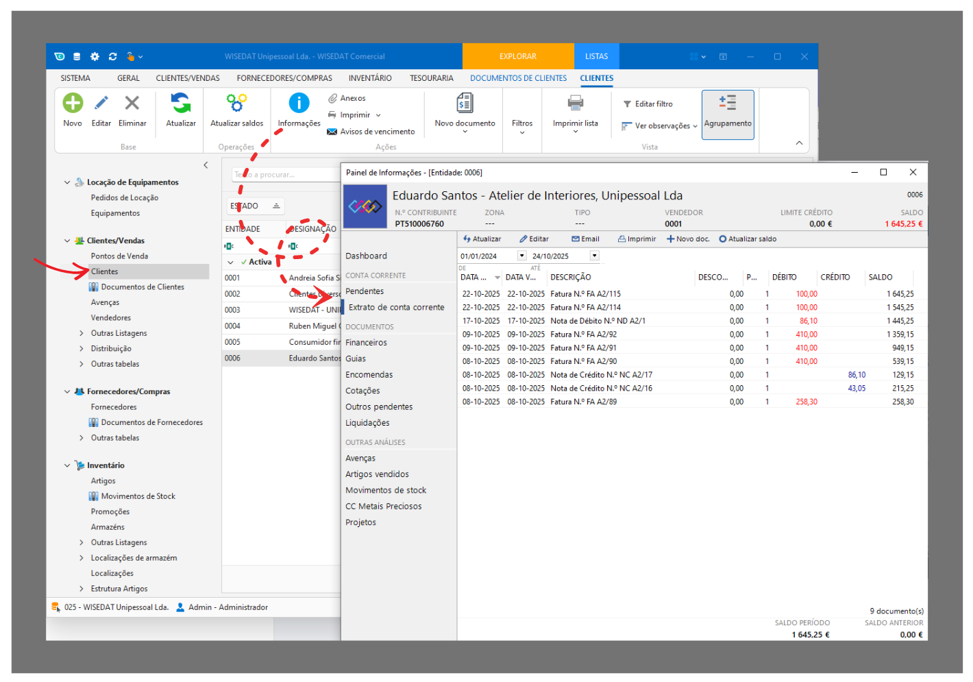No Wisedat Comercial aceda à listagem de Clientes ou Fornecedores (consoante o caso) e aceda ao Painel de Informações.