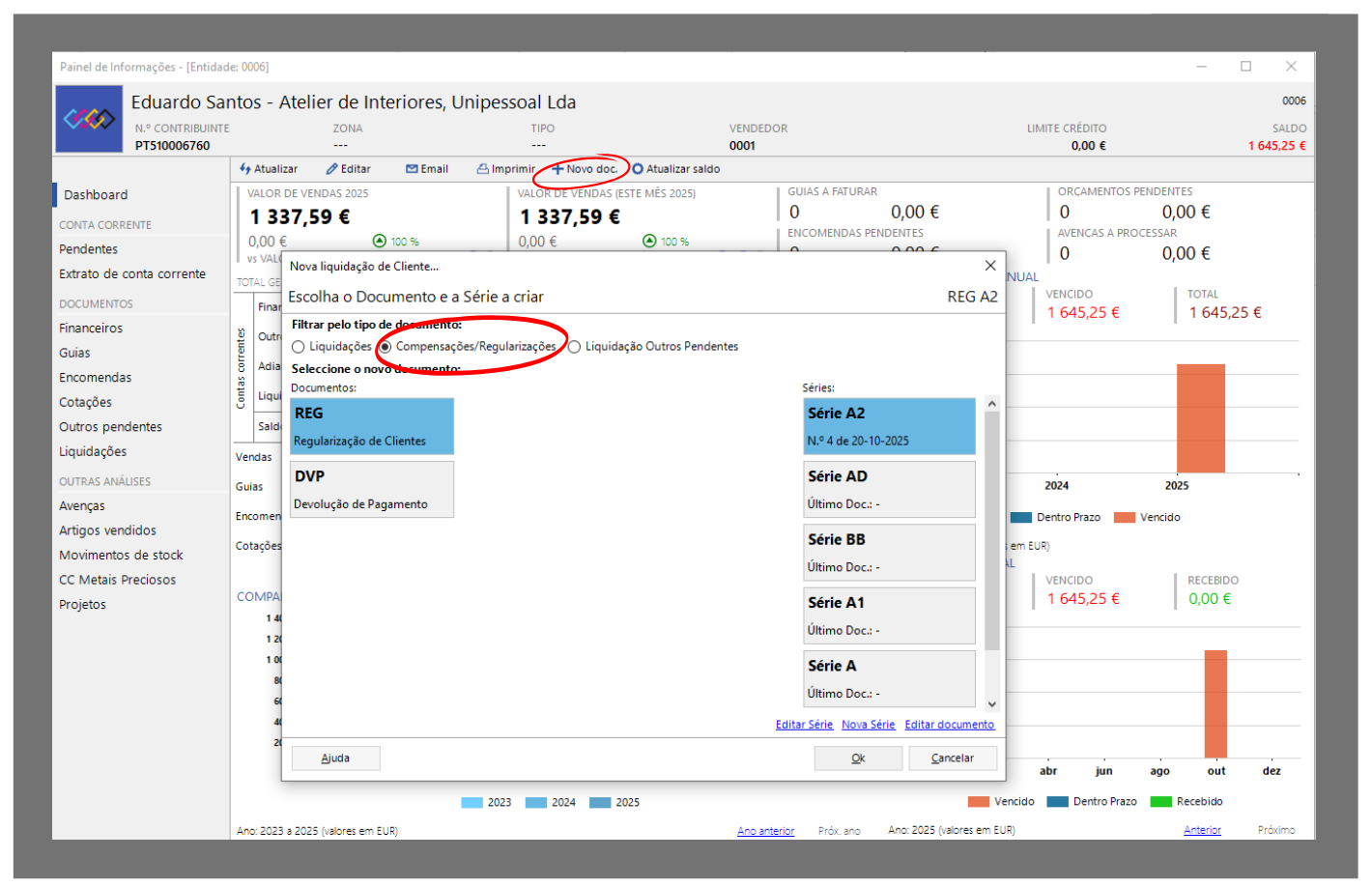 De forma a regularizar a conta corrente aponte para Novo documento Liquidação/Pagamento | Compensações/Regularização.