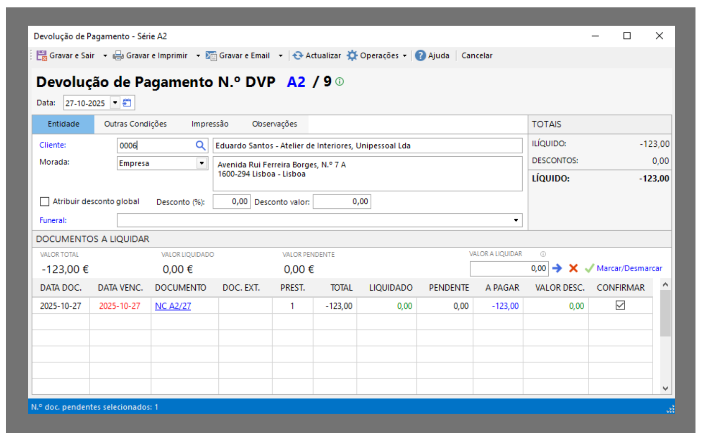 Se o cliente tiver valor em crédito em conta corrente deverá optar por efetuar uma devolução.