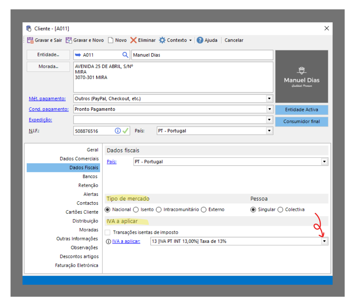 Existem cenários em o IVA é aplicado de acordo com o tipo de cliente/entidade, a aplicar aos artigos e serviços nos documentos emitidos à entidade. De forma a definir o IVA por entidade, aceda à ficha no separador: Dados fiscais.