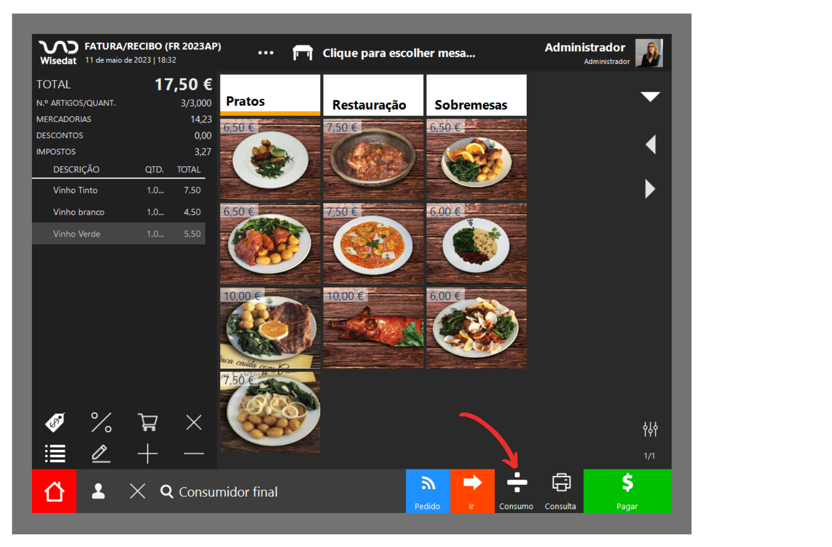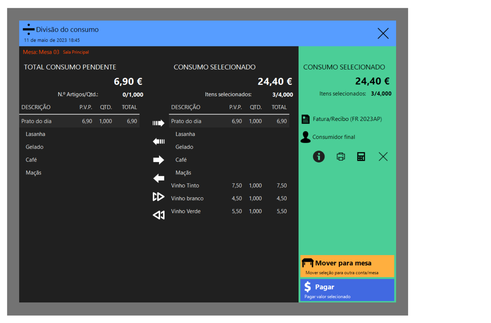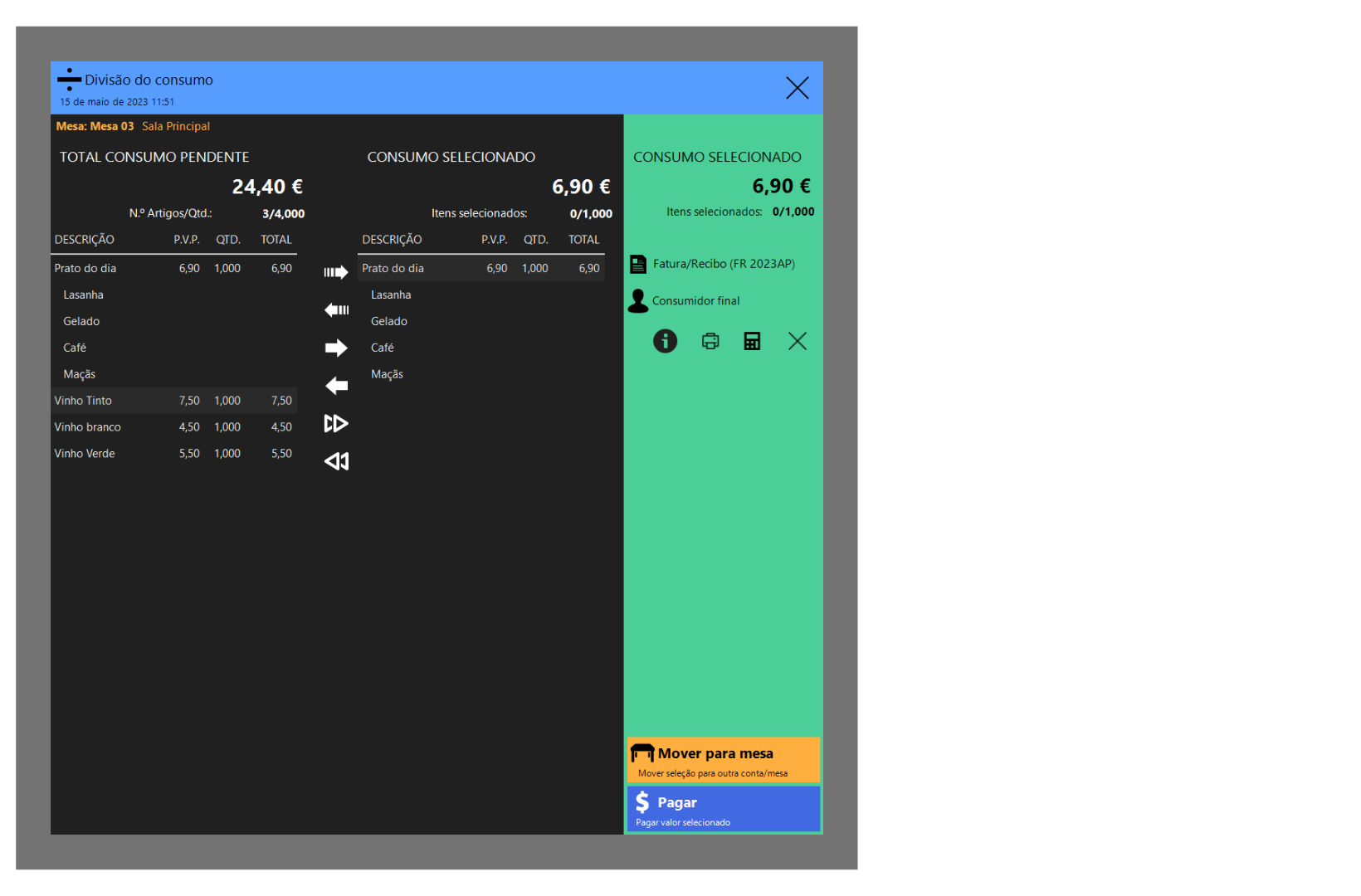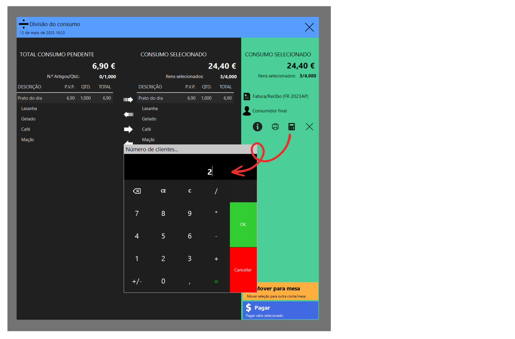Após mover o consumo clique no botão Pagar.