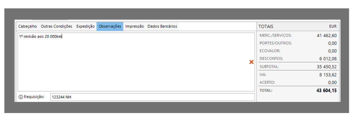 Nesta área poderá introduzir Observações a constar na impressão do documento ou na listagem de documentos