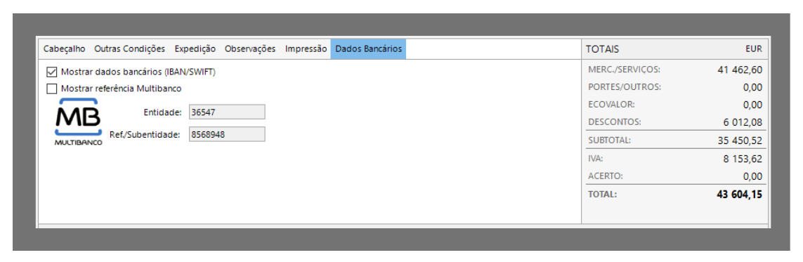 Mostrar dados bancários (NIB/IBAN/SWIFT) | Ao validar esta opção, os dados indicados são emitidos no documento |