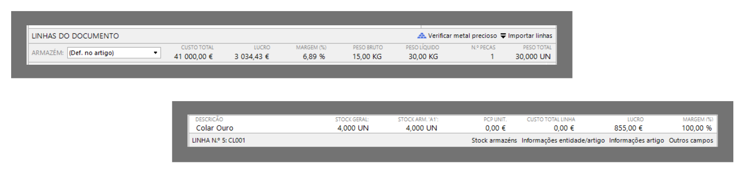 A barra abaixo da grelha de venda fornece-lhe toda a informação relativa a cada uma das linhas inseridas na grelha de venda. No entanto as informações relativas aos preços de compra e margem são indicadas de acordo com o parametrizado em Preferências.
