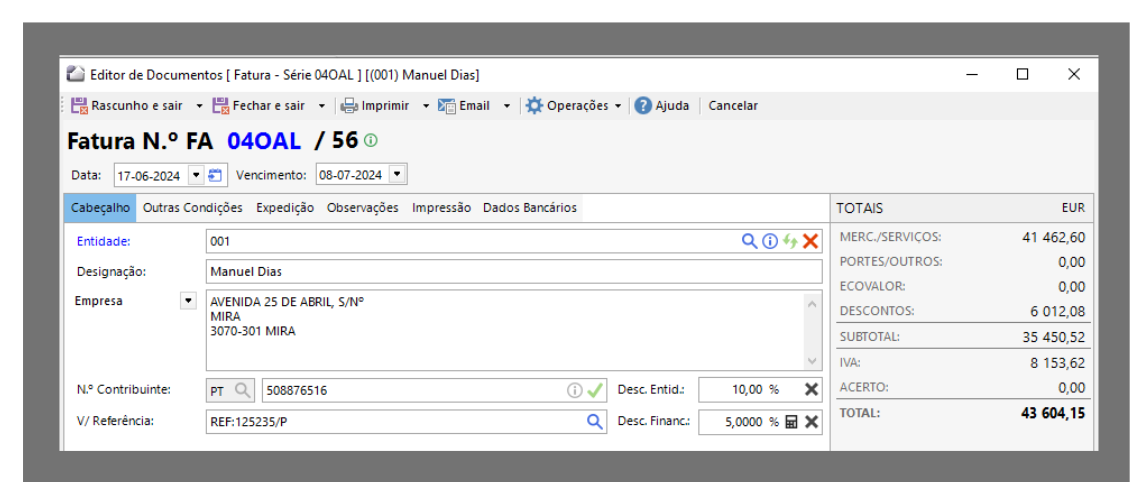 Desconto Financeiro | Desconto a atribuir ao documento. Afeta todas as linhas do documento. |