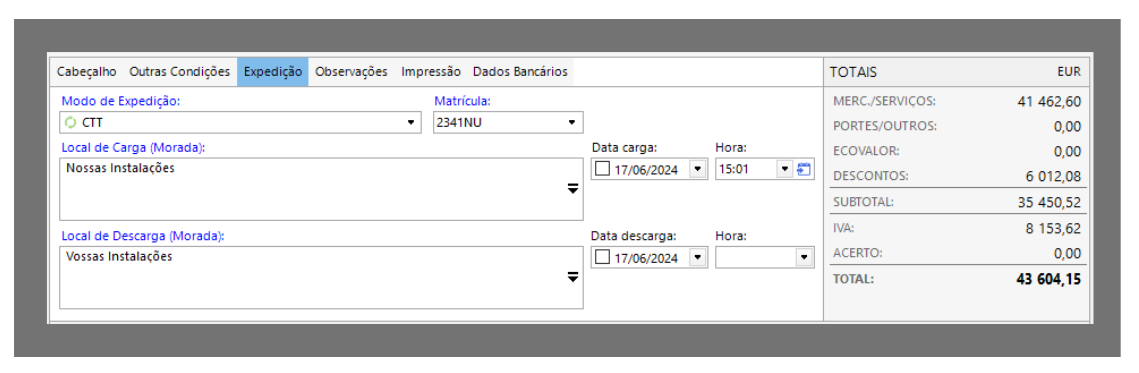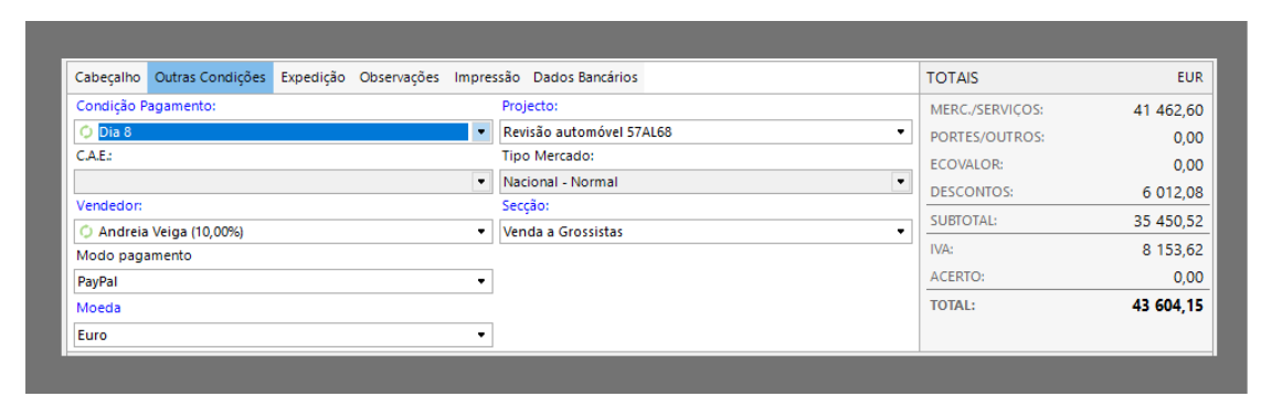 No cabeçalho do editor de documentos estão disponíveis vários elementos que importam salientar num documento de venda. Por omissão, as características assumidas são as que estão definidas na ficha do cliente e nas definições do documento de venda.