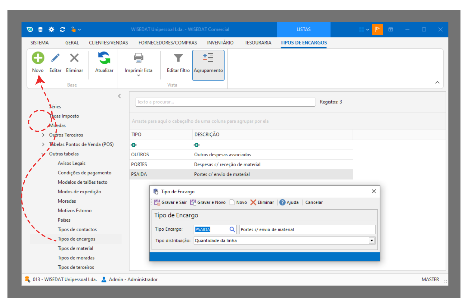 Por omissão o Wisedat disponibiliza vários tipos de encargos, no entanto poderá adicionar outros. No Wisedat Comercial aceda a Tabelas | Outras tabelas | Tipos de encargos e clique em Novo.