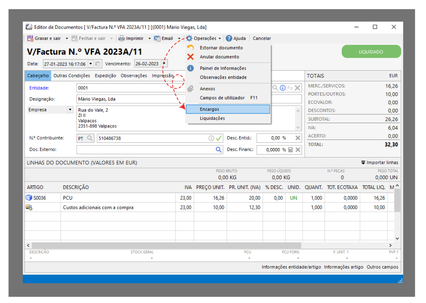 Emita um documento de fornecedor e nas linhas do documento, clique com o botão direito do rato, insira os Portes e/ou Custos Adicionais da Compra e indique o valor.