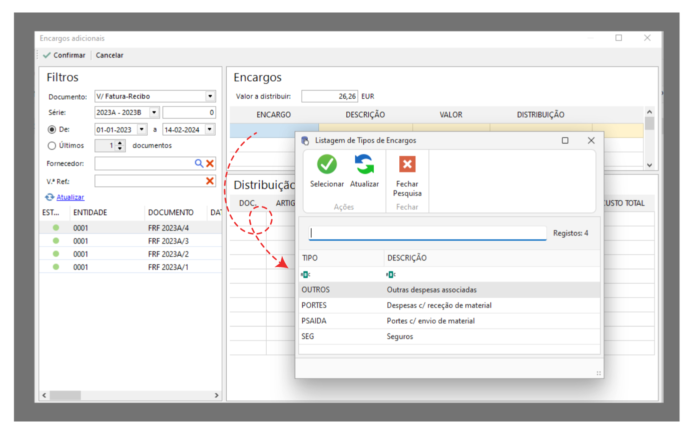 Para distribuir os valores dos encargos selecione os documentos de compra (duplo clique), de forma a tornar a sua pesquisa mais detalhada utilize os filtros disponíveis.
