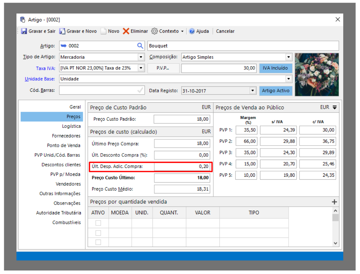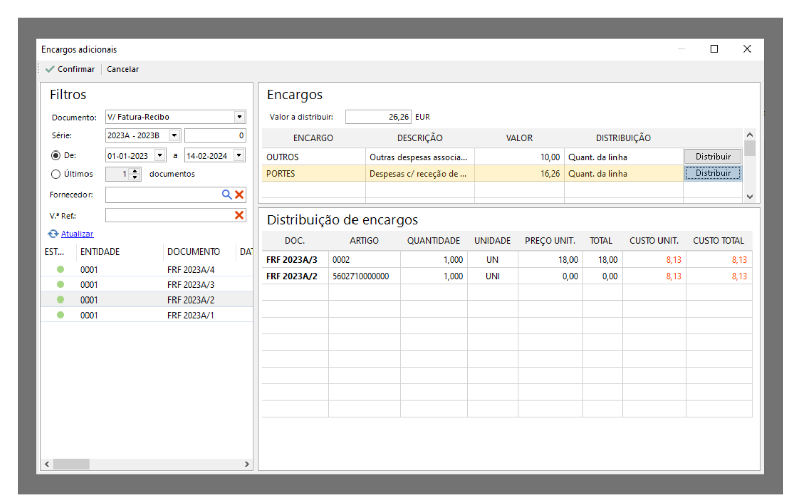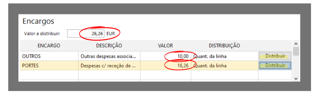 O lançamento de encargos permite imputar custos adicionais a mercadorias ou matérias-primas. Além dos Encargos adicionais também é possível adicionar um custo adicional nos outros campos da linha do artigo.