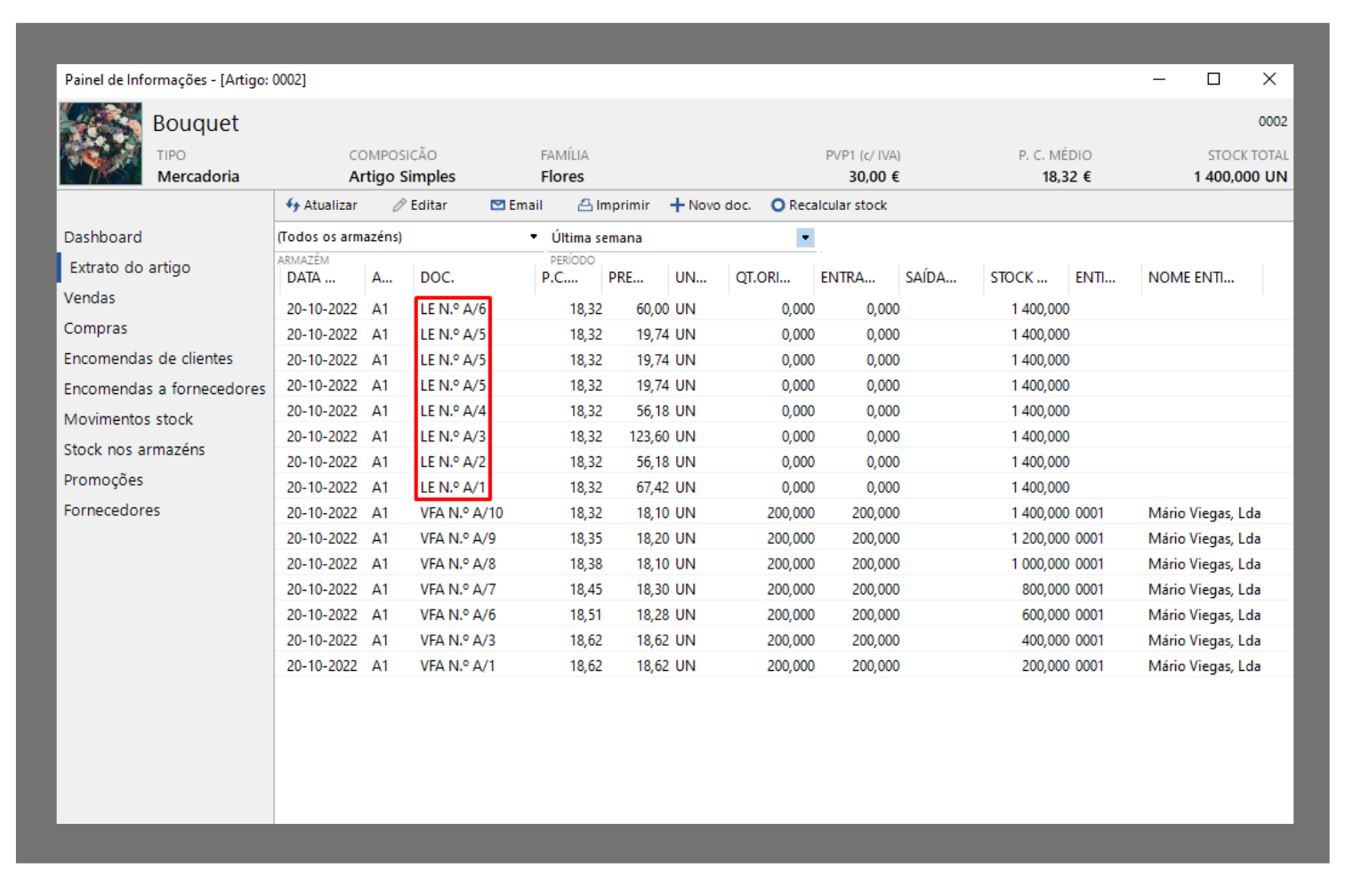 O movimento em stock Lançamento de Encargos indica-lhe através do extrato do artigo que foram lançados encargos adicionais.