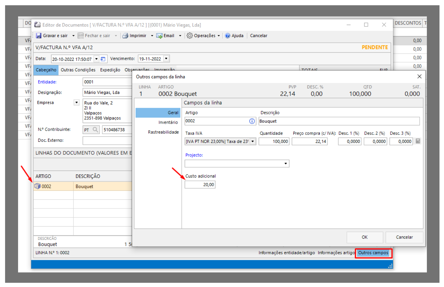 O Wisedat disponibiliza uma forma de adicionar um custo em linha. No documento de compra, selecione a linha e clique na opção Outros Campos (em baixo) | Geral e indique o Custo adicional.