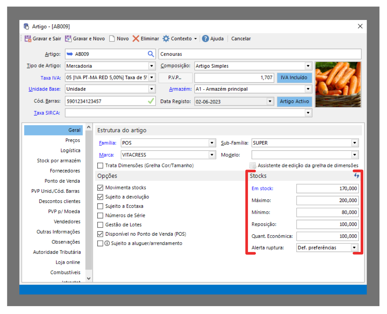 Definir stock mínimo, máximo, reposição e quantidade económica
