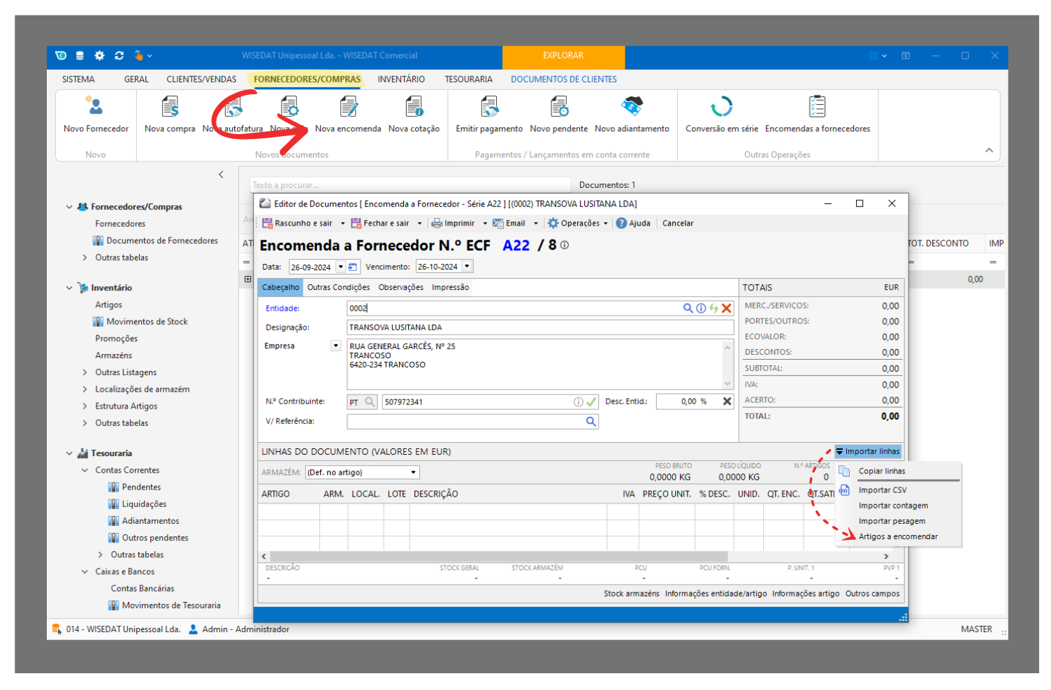 Na área de Fornecedores/Compras selecione a opção Nova encomenda, no editor do documento aceda a Importar linhas | Artigos a encomendar.