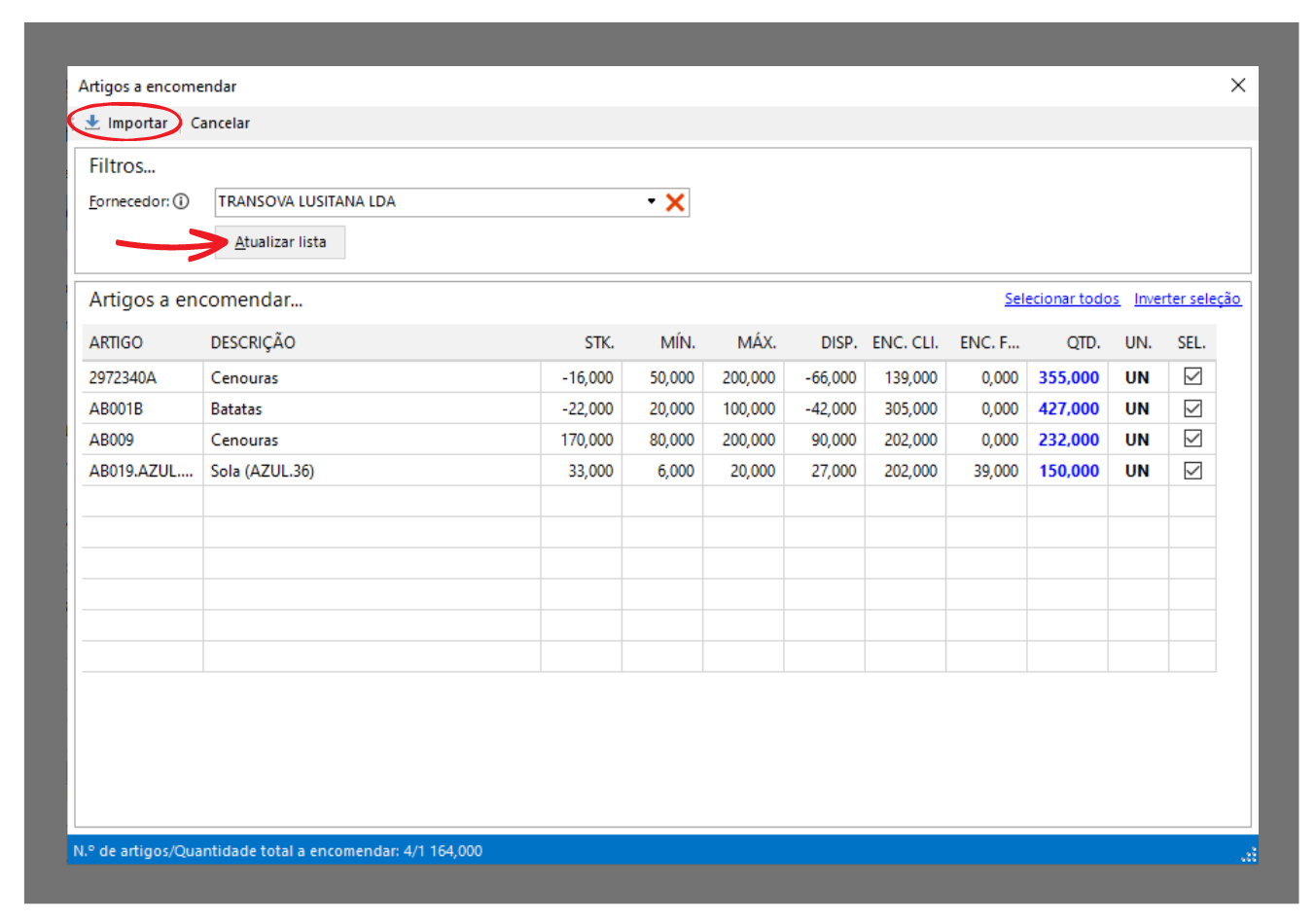 De forma a importar os artigos e respetivas quantidades a encomendar clique em Importar.