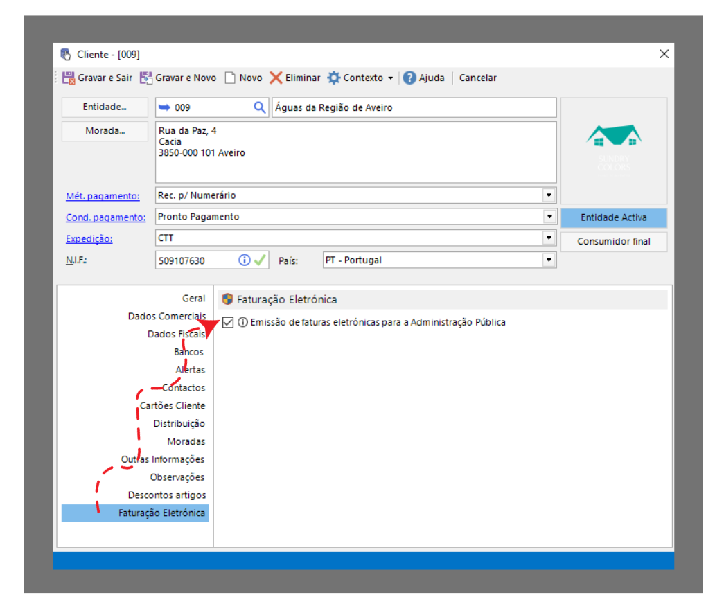 Ative a comunicação de faturas no formato eSPap-UBL 2.1 CIUS-PT. Na Ficha de Cliente aceda ao separador Fatura Eletrónica e valide a opção: Emissão de faturas eletrónicas para a Administração Pública.