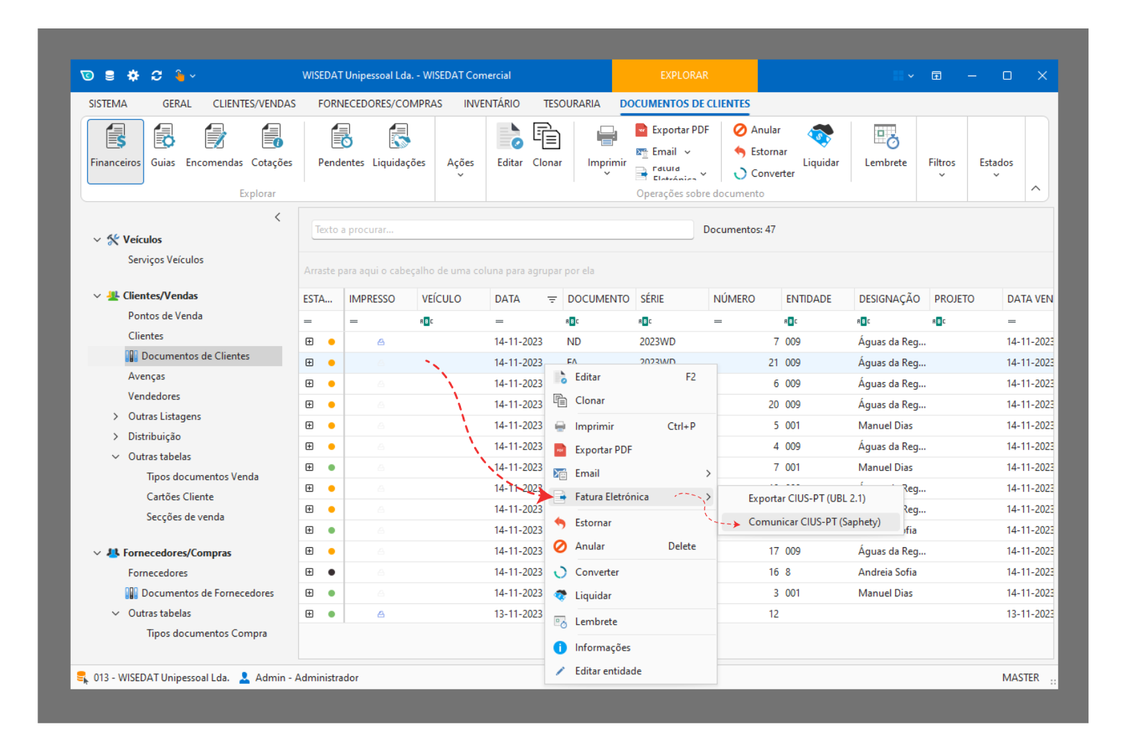 Em Documentos de Clientes | Financeiros, selecione o documento, clique com o botão direito do rato e escolha a opção: Comunicar CIUS-PT (Saphety).