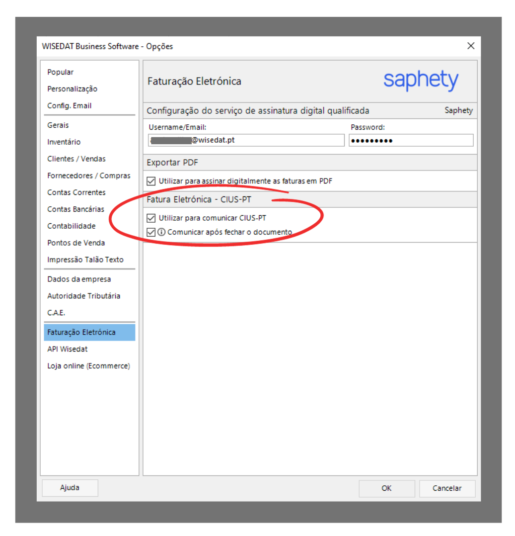 De modo a começar a enviar Faturas Eletrónicas aceda a Preferências | Faturação Eletrónica e insira as credenciais da Saphety e valide a opção: Utilizar para comunicar CIUS-PT.