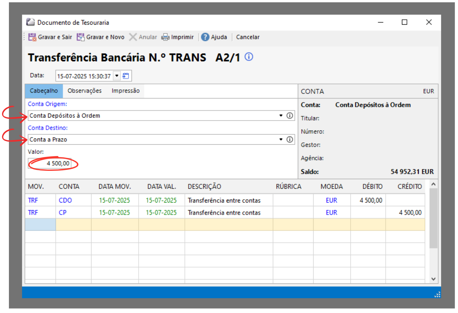 Indique a Conta Origem e a Conta Destino indicando o valor a transferir da conta de origem para conta destino.