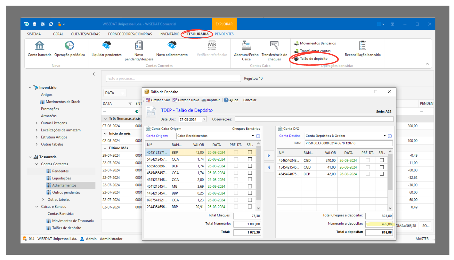 Consulte mais informações no tópico de ajuda: Talões de Depósito.