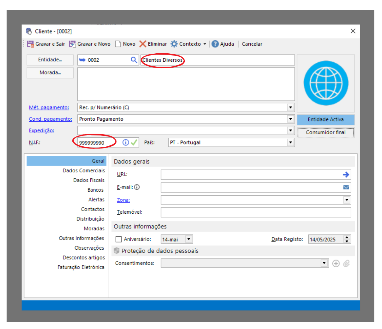 Aceda ao menu Cliente/Vendas, preencha a ficha cliente, inserindo uma designação genérica, por exemplo Clientes Diversos e com o NIF 999999990.