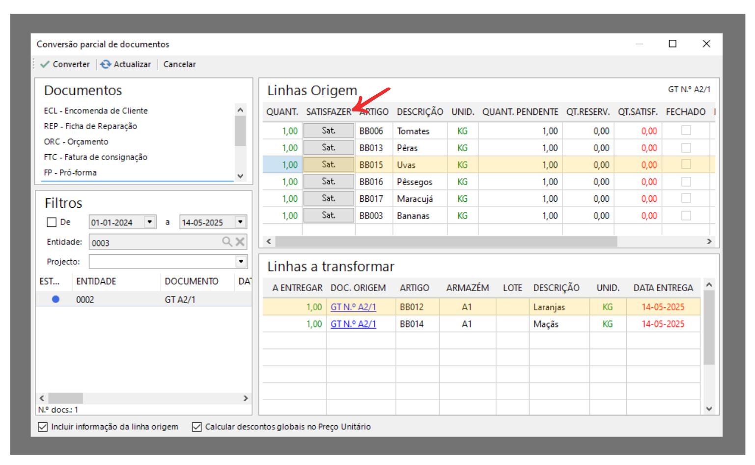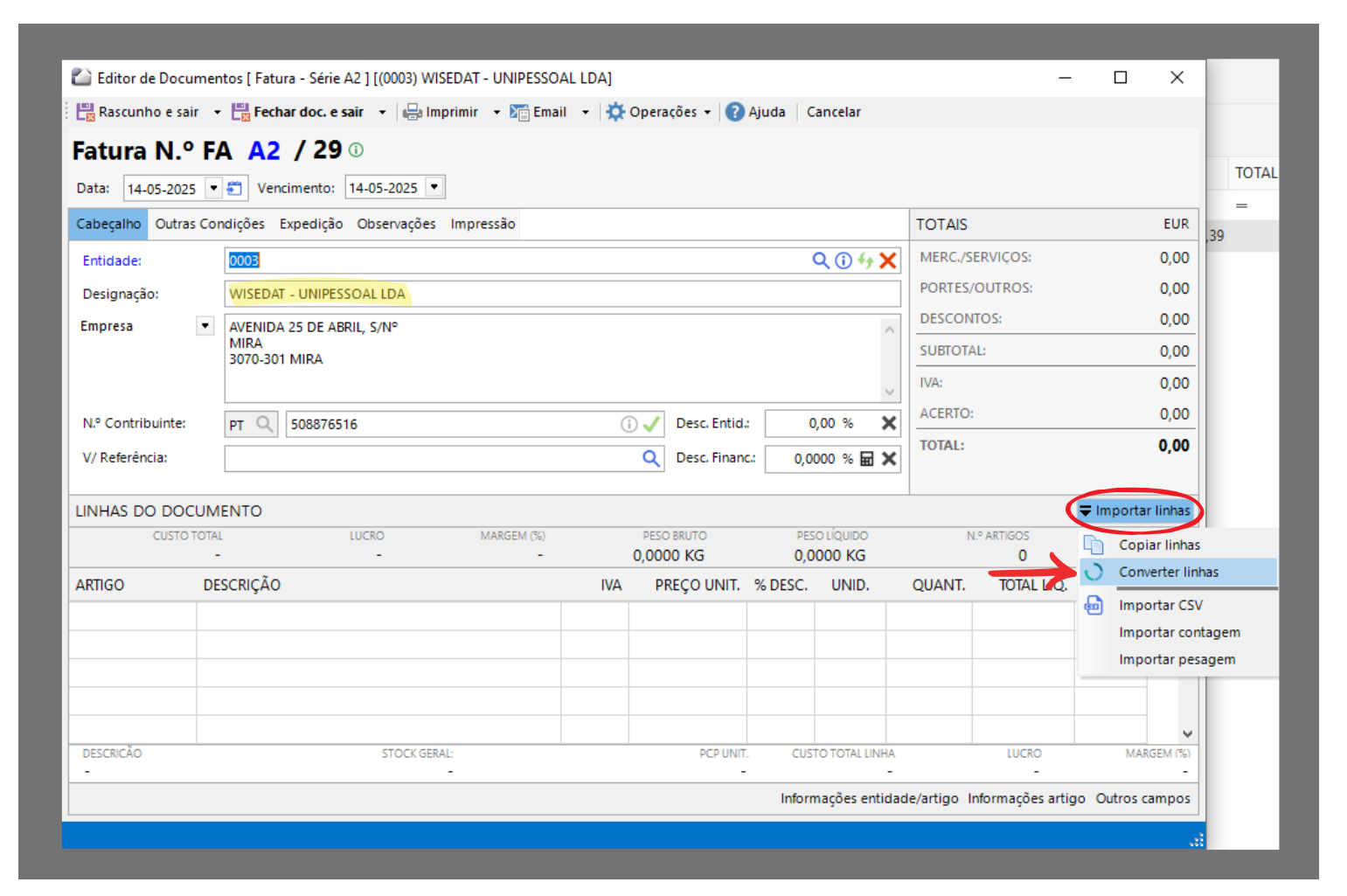 Aceda a Clientes/Vendas | Nova Venda e selecione um tipo de documento de venda, por exemplo a fatura, insira a entidade para a qual quer emitir o documento. Clique em Importar linhas, opção Converter Linhas.