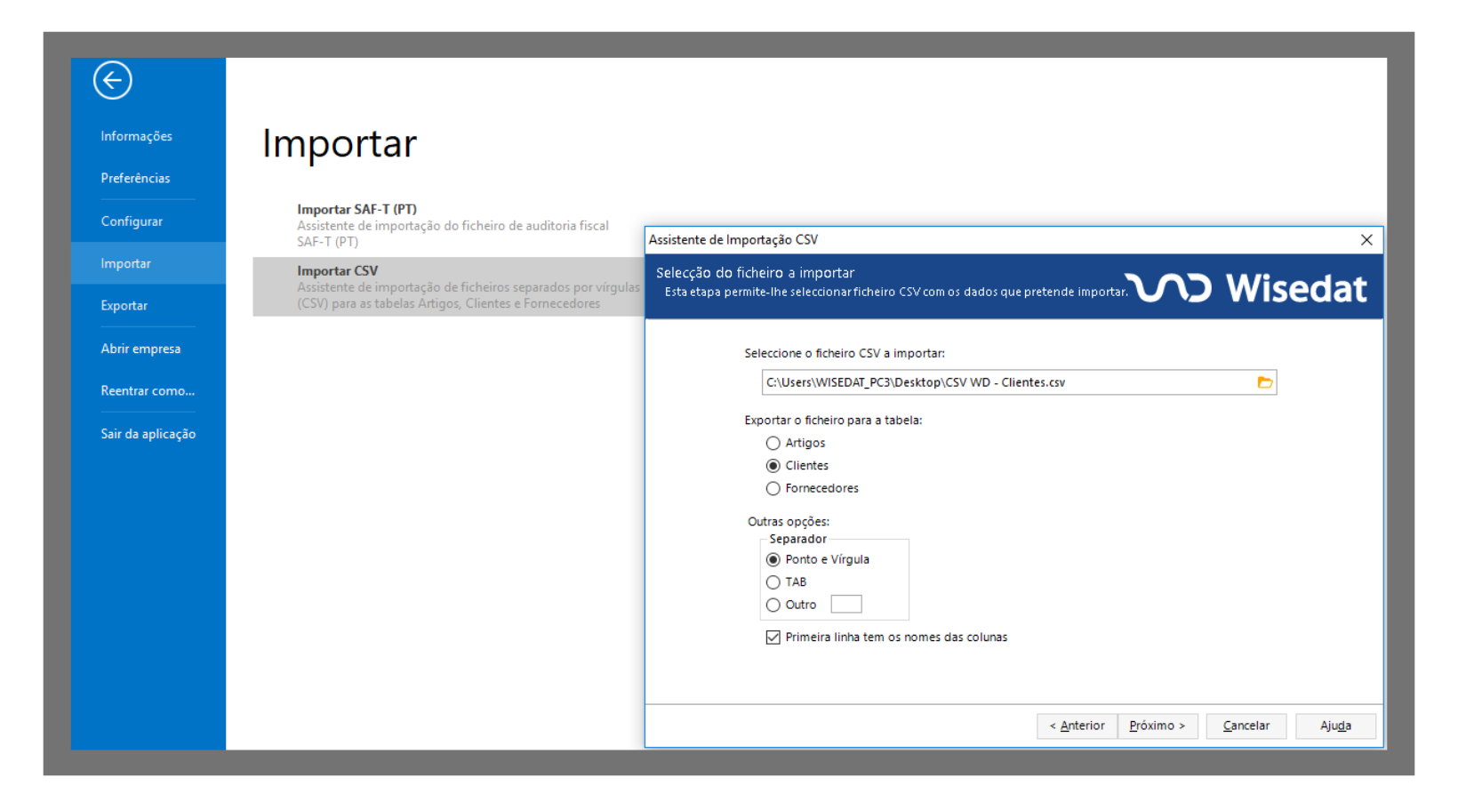 Através do Wisedat Comercial pode importar de dados a partir de ficheiros SAF–T (PT) ou ficheiros CSV (Comma-Separated Values).