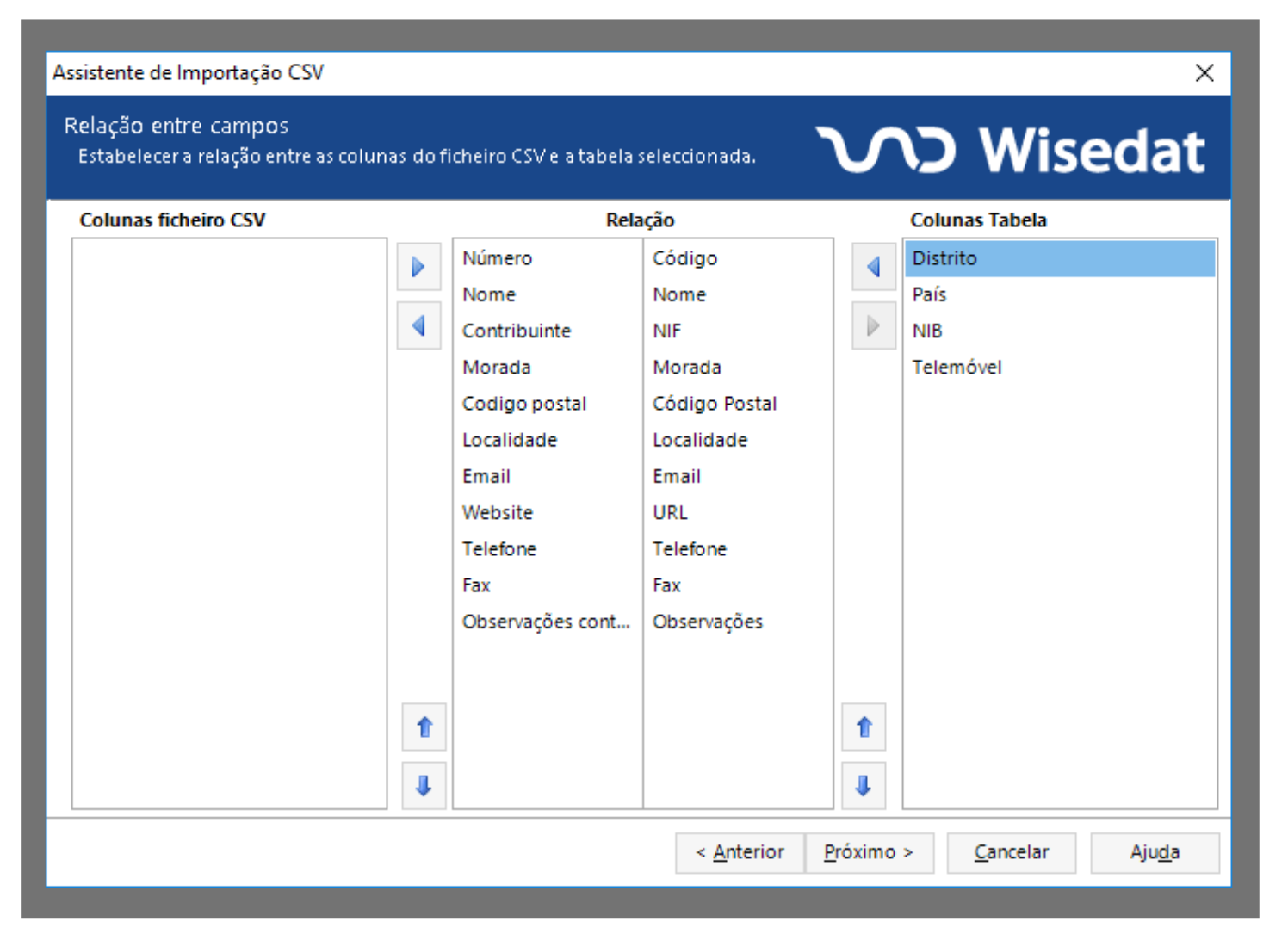 - Selecionar as colunas do ficheiro CSV (pode fazer duplo-clique no item da lista) que estão relacionadas com as colunas obrigatórias da tabela e estabelecer a relação entre as diversas colunas existentes.