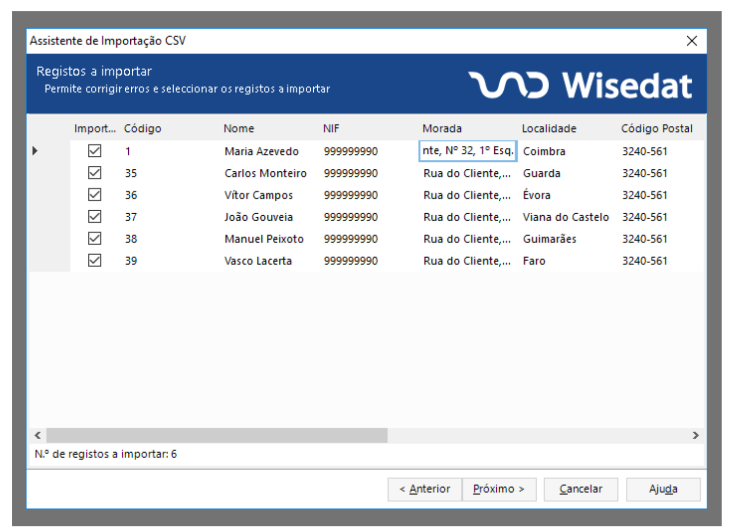 - Em caso de erros deve editar a célula com o erro e corrigir o valor. Em alternativa poderá retirar o registo da importação;