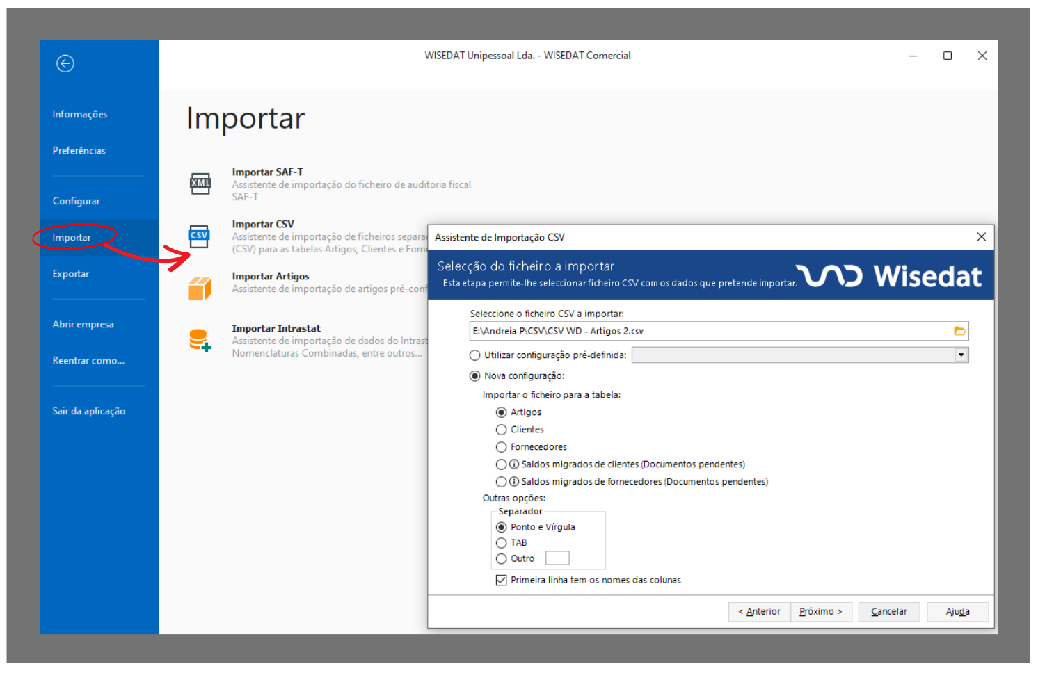 Além disso, através do WISEDAT Comercial, pode importar dados a partir de ficheiros SAF-T ou CSV (Comma-Separated Values), garantindo flexibilidade na integração de informação.