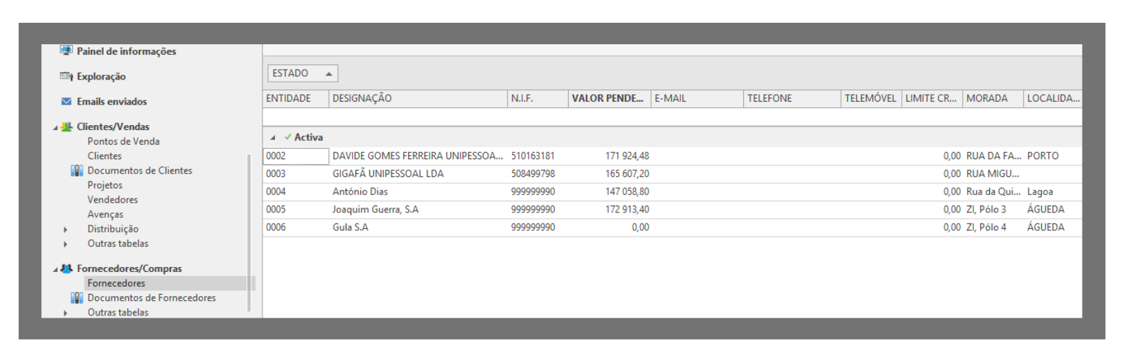 4º – À semelhança da tabela de Clientes, pode também importar e alterar os seguintes dados: Código, NIF, Designação, Contacto, Telefone, Fax, E-mail, URL, Endereço de entrega e faturação.