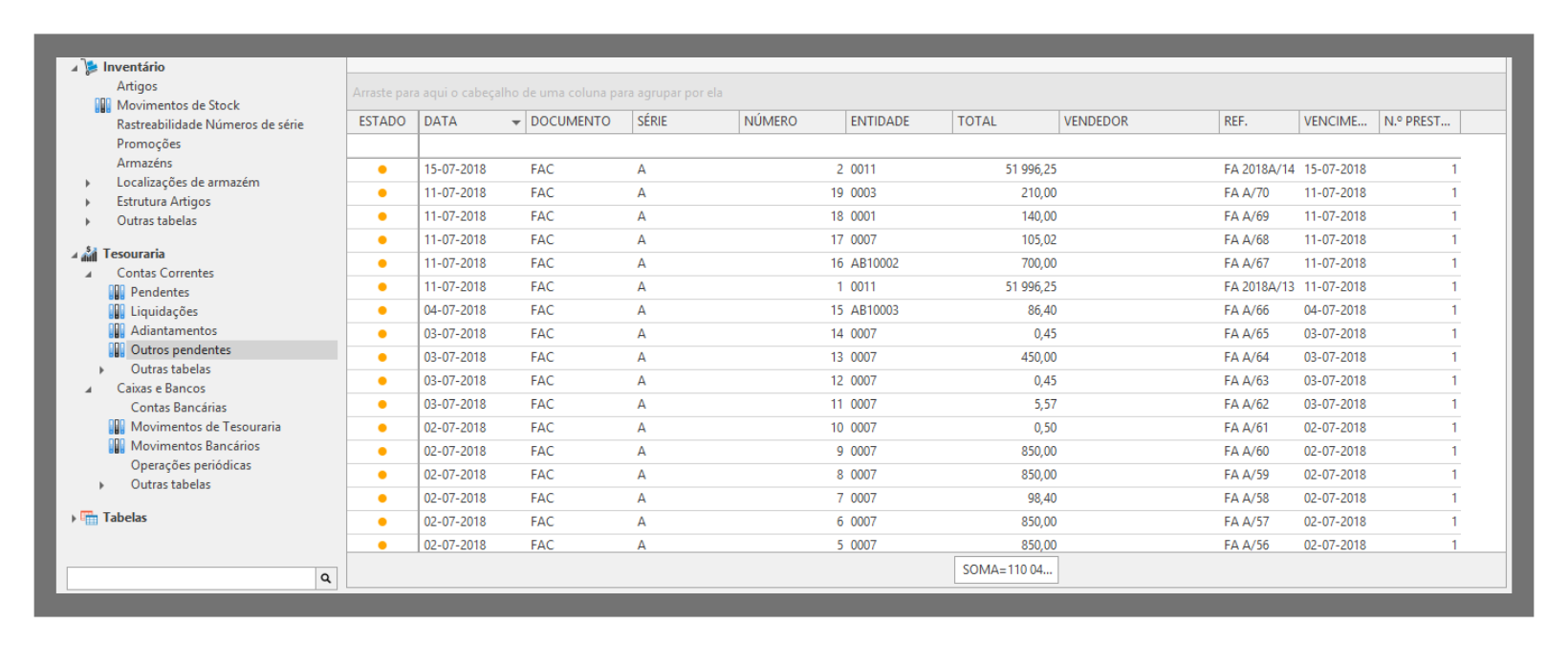 Neste listagem encontra os documentos importados via SAF-T, navegador lateral, Tesouraria | Outros pendentes.
