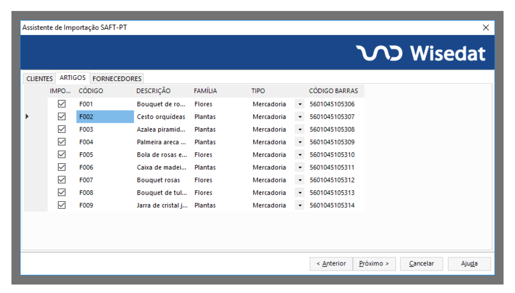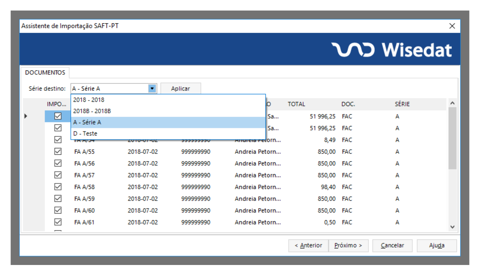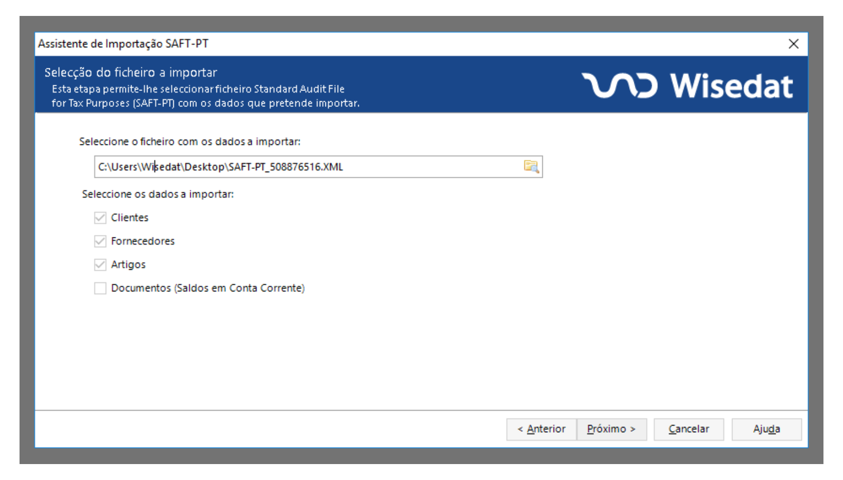 Este processo agiliza a migração de software, pois pode importar o ficheiro SAF-T exportado no seu antigo software para o Wisedat.