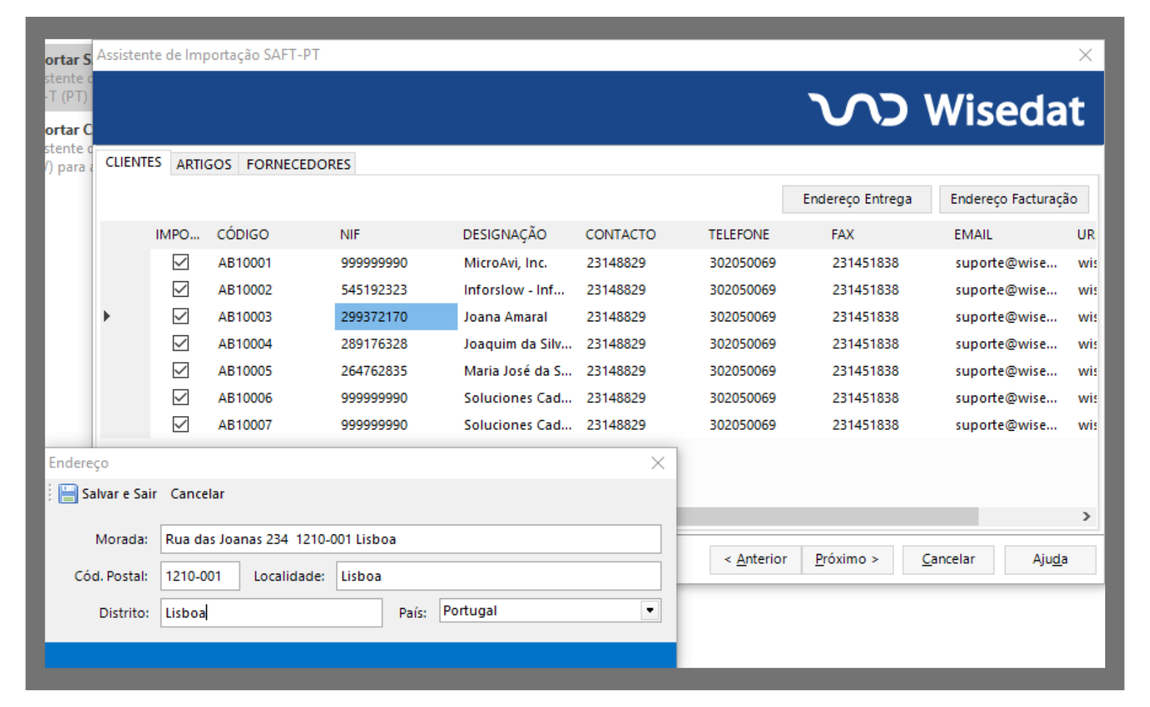2º – Na importação de clientes, pode retirar a seleção aos clientes que não pretende importar e aproveitar para atualizar os vários campos tais como: Código de cliente, NIF, Designação, E-mail, URL, Endereço de entrega e faturação.