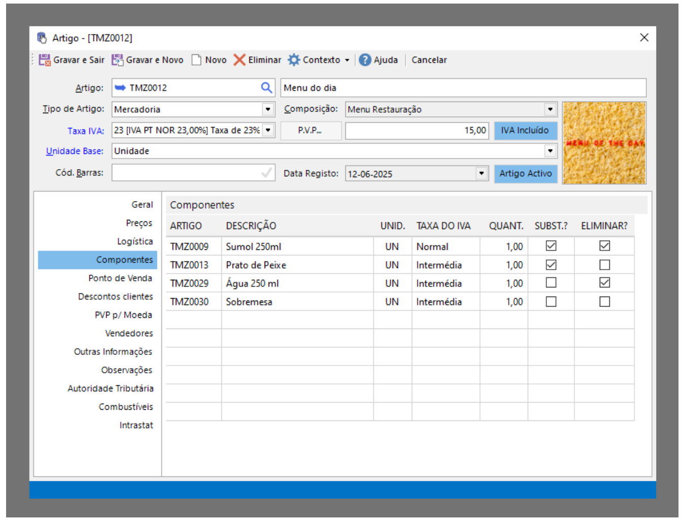 Nota: Os artigos componentes deverão estar previamente inseridos na sua base de dados e com indicação do preço, caso contrário não é possível adicionar os artigos componentes.