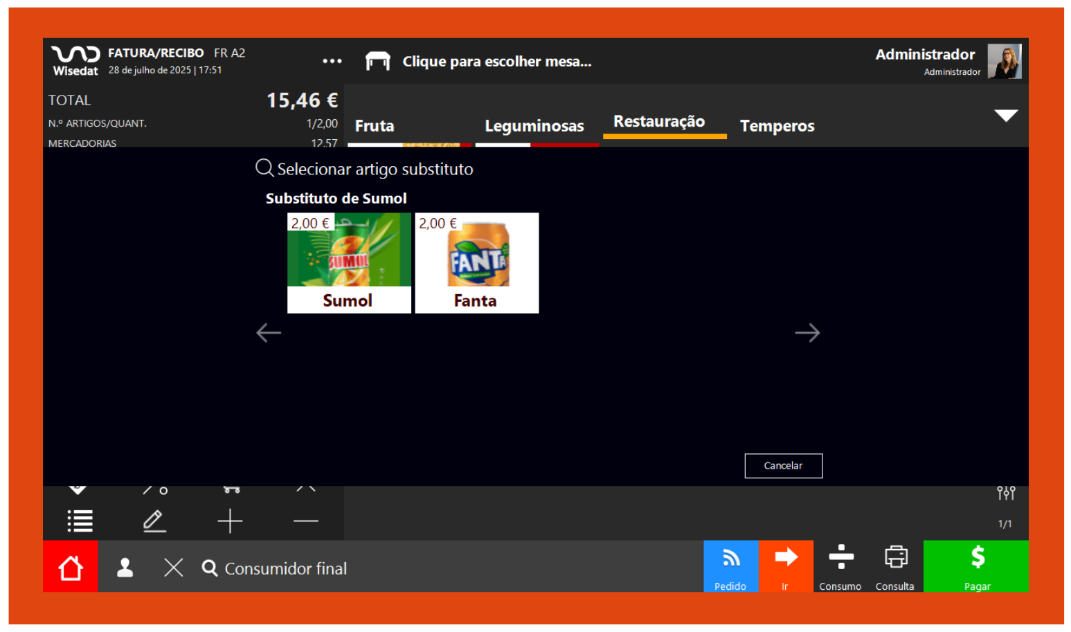 Quando insere o menu restauração na grelha de venda surgirá a grelha com os artigos a substituir de forma automática.