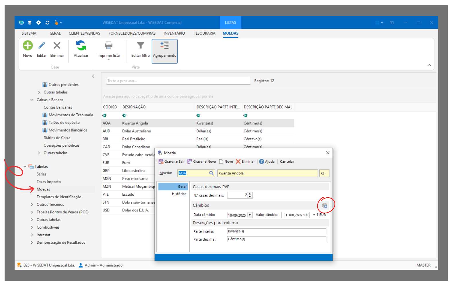 No WISEDAT Comercial no navegador lateral aceda a Tabelas | Moedas, selecione a moeda e na área de Câmbios atribua uma data e o valor do câmbio à moeda a que está a transacionar.