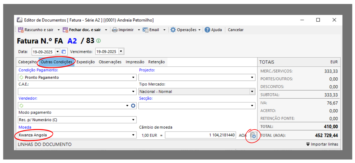 Sempre que existe necessidade de utilizar uma moeda diferente da moeda base é importante que se defina o valor do câmbio correto nos documentos.
