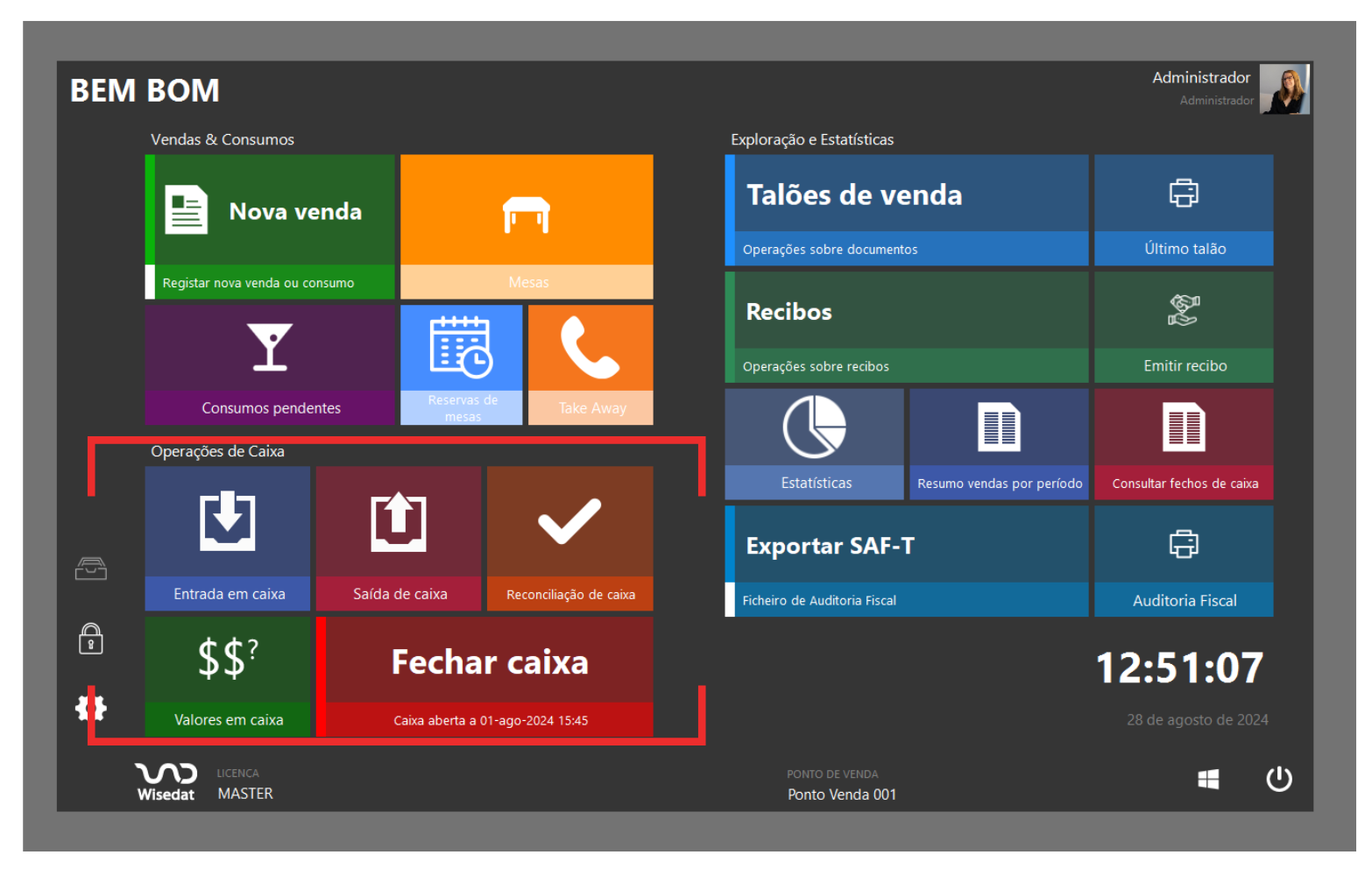 A partir do ecrã principal é possível realizar diversas operações sobre a caixa, tais como: