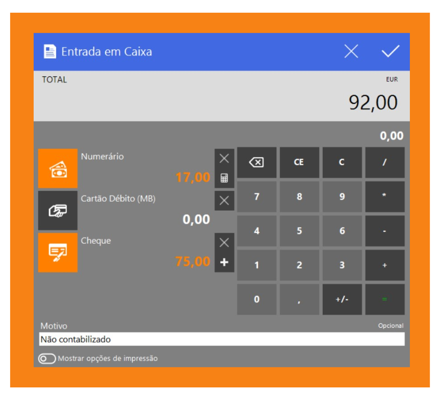 Faça o registo de uma entrada de caixa, em numerário multibanco ou cheque.