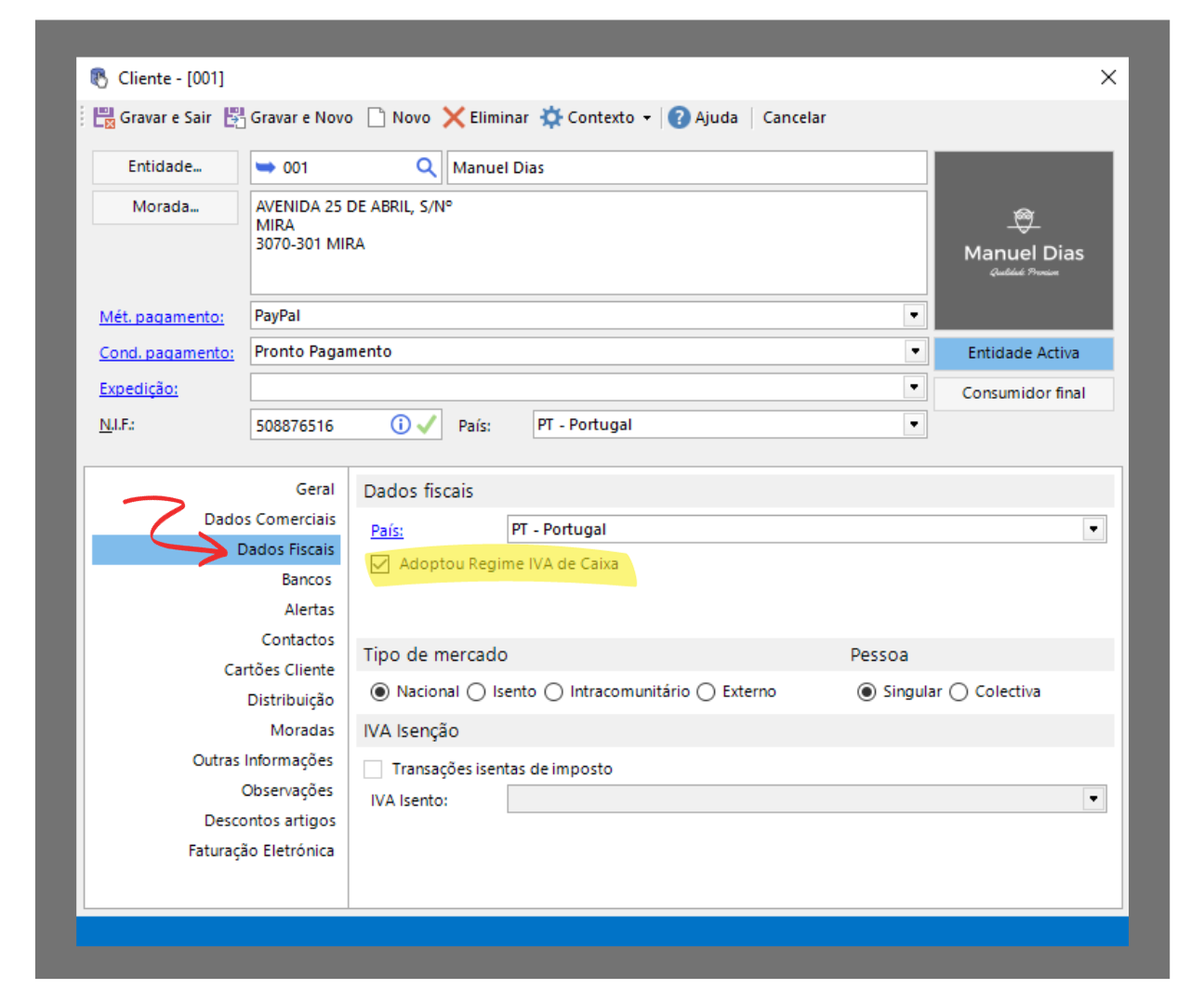 E aceda à Ficha de Cliente | Dados Fiscais e selecione a opção: Adaptou o Regime IVA de Caixa.
