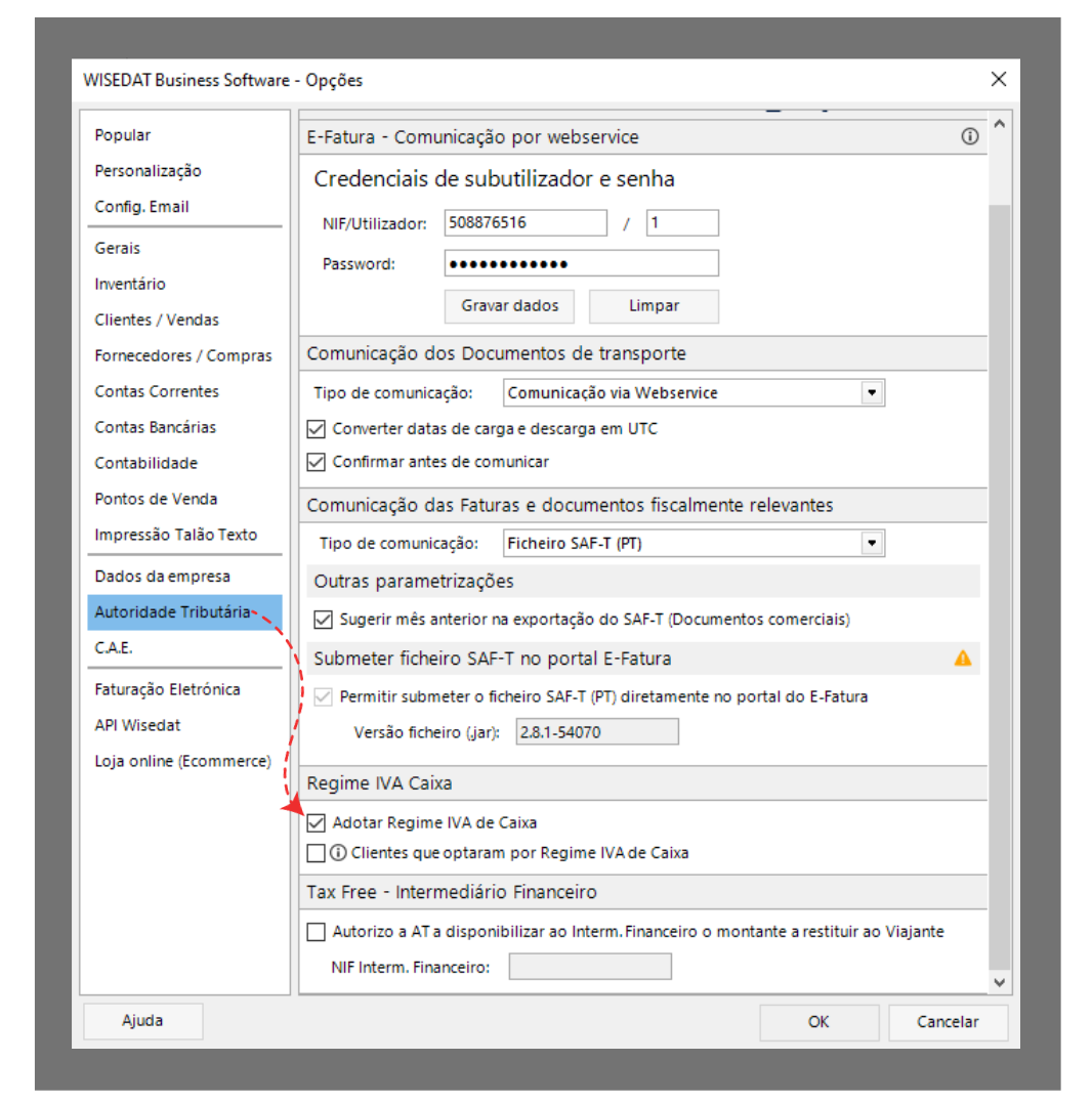 Caso a sua empresa esteja abrangida pelo Regime de IVA de Caixa, no Wisedat Comercial aceda a Preferências, no separador Autoridade Tributária valide a opção Adotar Regime IVA de Caixa.