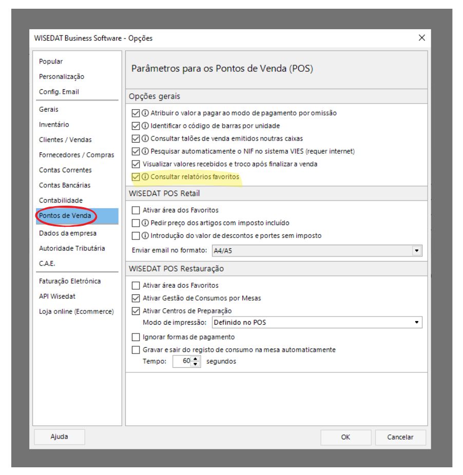 Para disponibilizar os relatórios nos front-office POS, aceda a Preferências | Pontos de Venda, validando a opção: