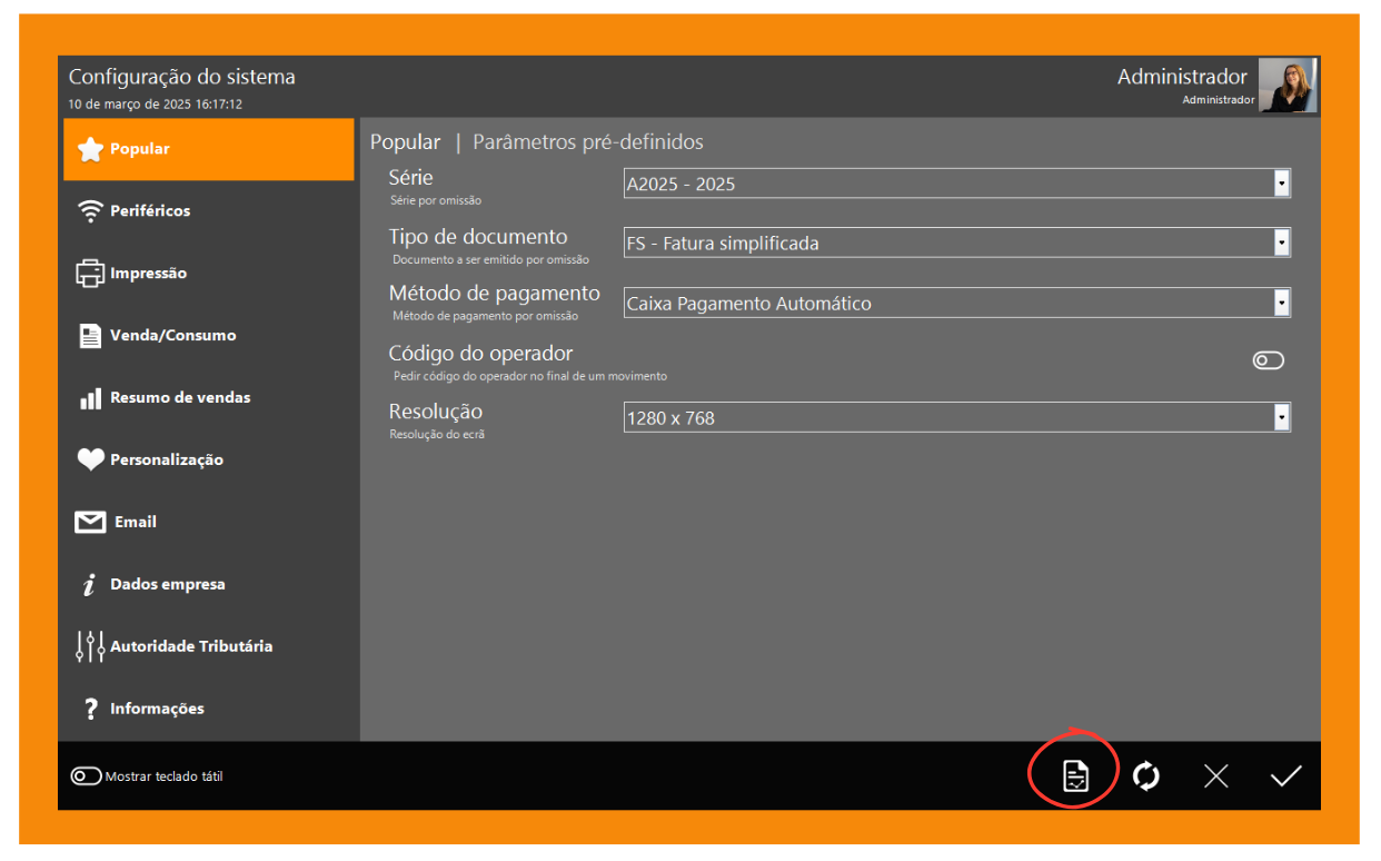 De forma a consultar os relatórios favoritos no WISEDAT POS Restaurant aceda a Configurações e clique no ícone assinalado na imagem.