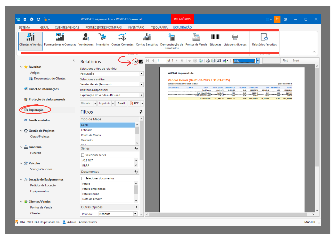 A área da Exploração oferece-lhe inúmeros relatórios que lhe permitem uma análise detalhada de todos os movimentos efetuados na empresa, assim como diversas listagens e etiquetas. Qualquer um dos relatórios poderá ser adicionado à área de Favoritos de forma a facilitar o acesso, podendo fixar os filtros aplicados.