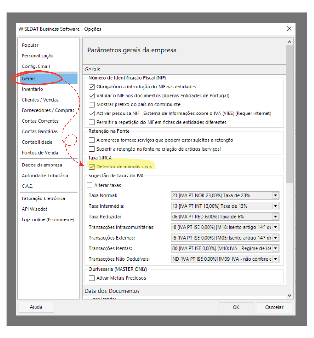 De forma a puder emitir faturas com a taxa SIRCA, no Wisedat Comercial aceda a Sistema | Preferências e no separador Geral valide a opção, Detentor de animais vivos.